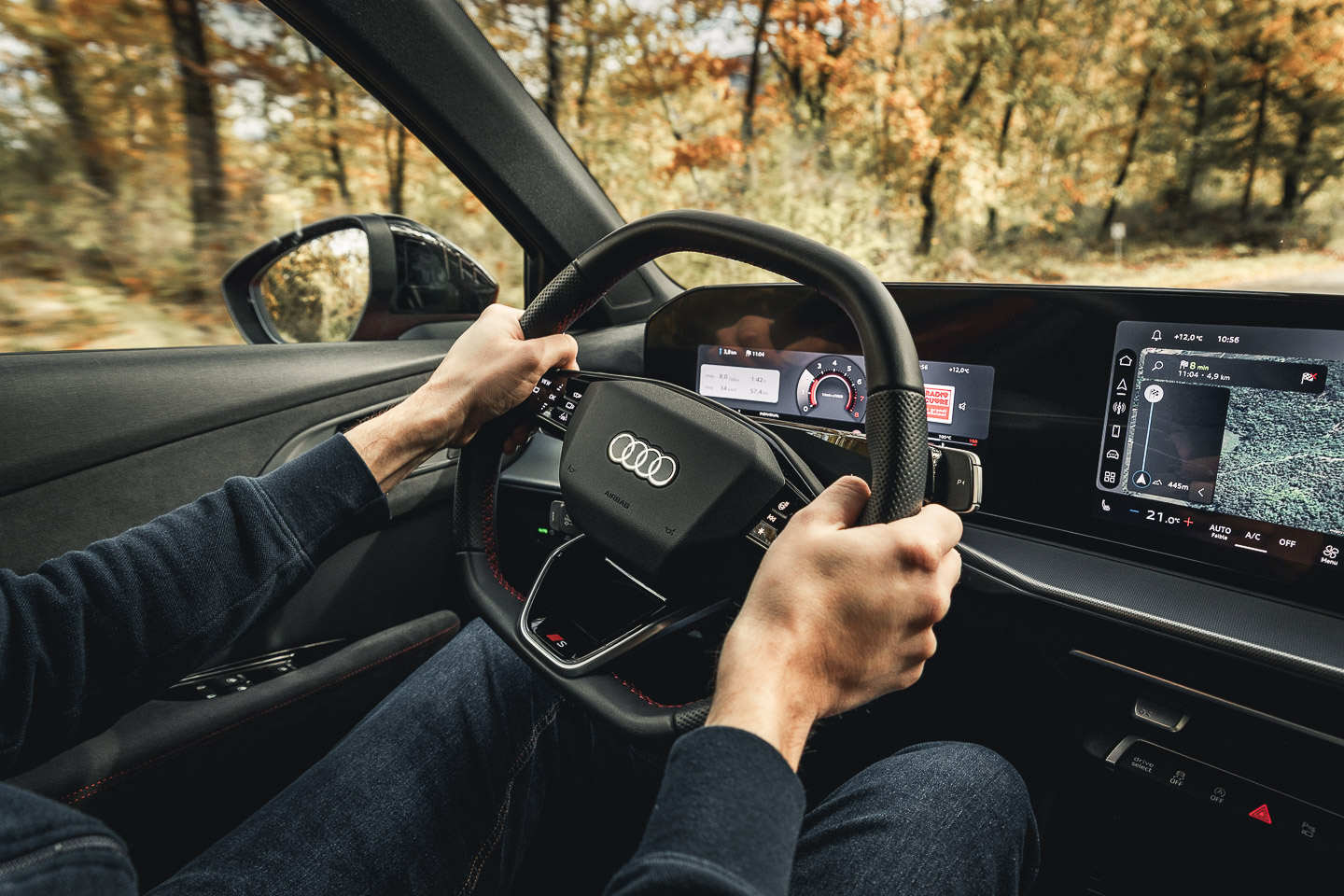 L’habitacle du précédent Q3 accusait un certain retard par rapport à la concurrence premium, mais ça, c’est de l’histoire ancienne. La planche de bord adopte à présent le style apparu sur les dernières nouveautés du constructeur avec la grande double dalle de 11,9″ et 12,8″. Ces derniers viennent avec la toute dernière version du MMI et son nouveau design de menus, moins sombre qu’auparavant. Avec cette version, la navigation sur le compteur numérique fait son retour, facilitant l’utilisation de l’écran central où l’on retrouvera un store sur lequel une multitude d’applications, autant musicales que de divertissement, seront téléchargeables. On ignore encore si ce nouveau design arrivera sur l’ensemble des modèles, mais selon moi, il y a des chances car l’objectif est d’harmoniser le tout avec la récente refonte de l’application connectée et du site web.