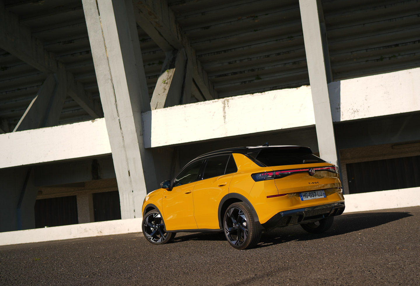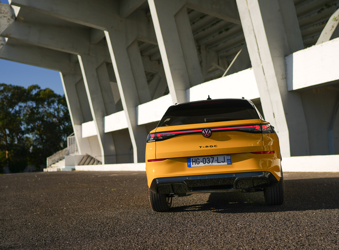 Les lignes de flanc sont plus tendues, avec des nervures marquées donnant un caractère sportif. Le profil reste très reconnaissable : ligne de toit fuyante, poignées de porte affleurantes sur les versions haut de gamme, passages de roue soulignés. En finition R-Line, jantes jusqu’à 20 pouces, boucliers sculptés, coques de rétros noires brillantes et diffuseur arrière prononcé, il en jette vraiment, surtout dans cette teinte Jaune Canary. Je retrouve réellement les traits du Tiguan (que je trouve très réussi, vous pouvez lire son essai ici), cela donne à ce nouveau T-Roc un côté très statutaire bien plus prononcé que la précédente génération.