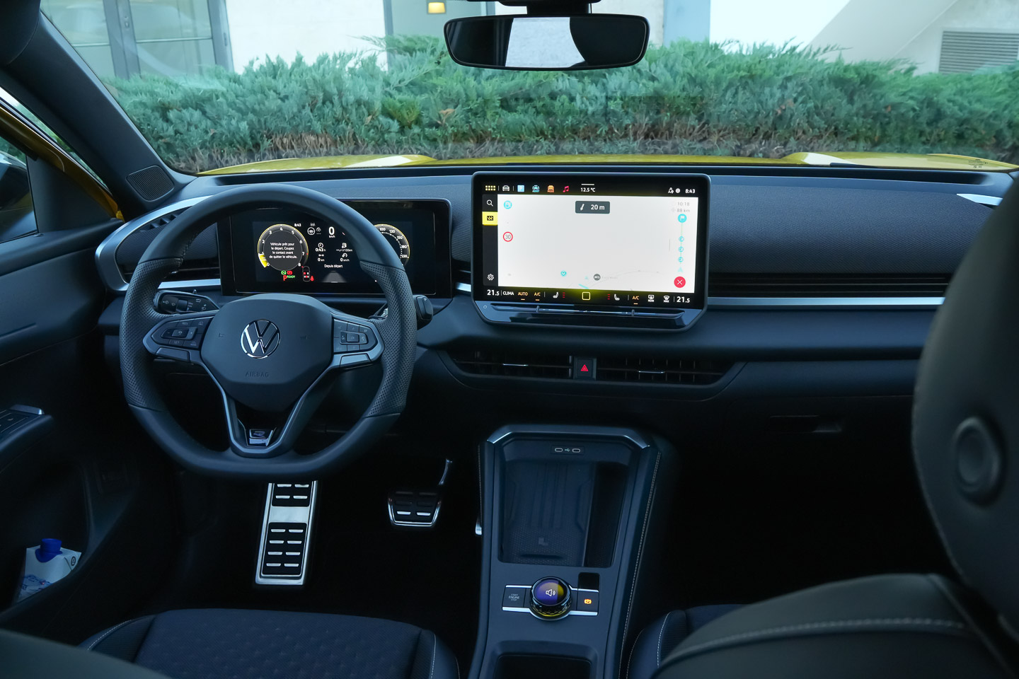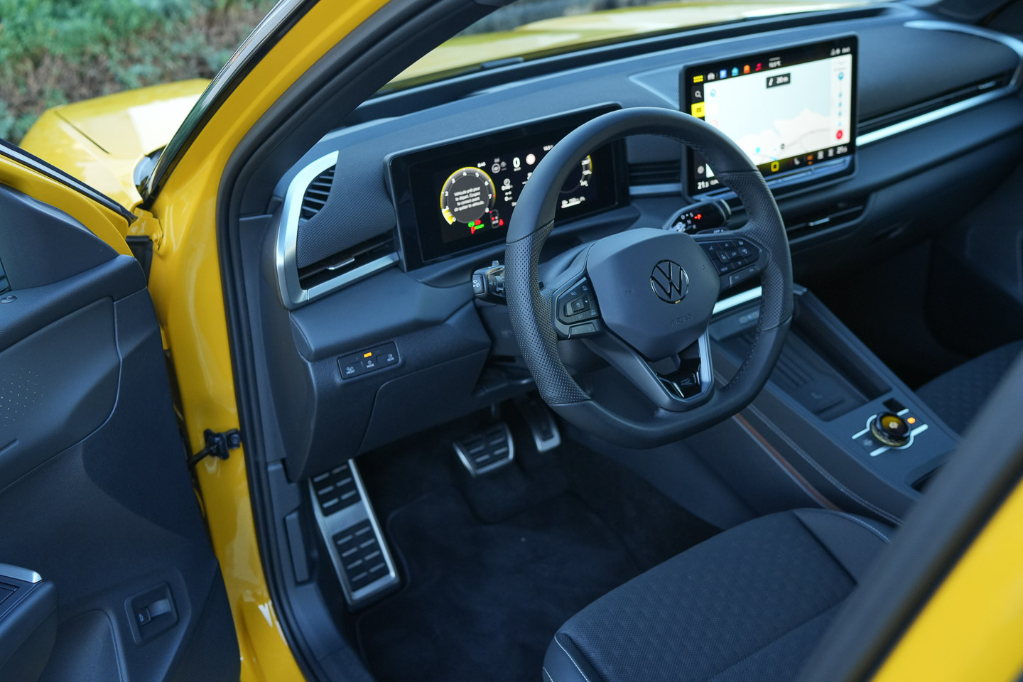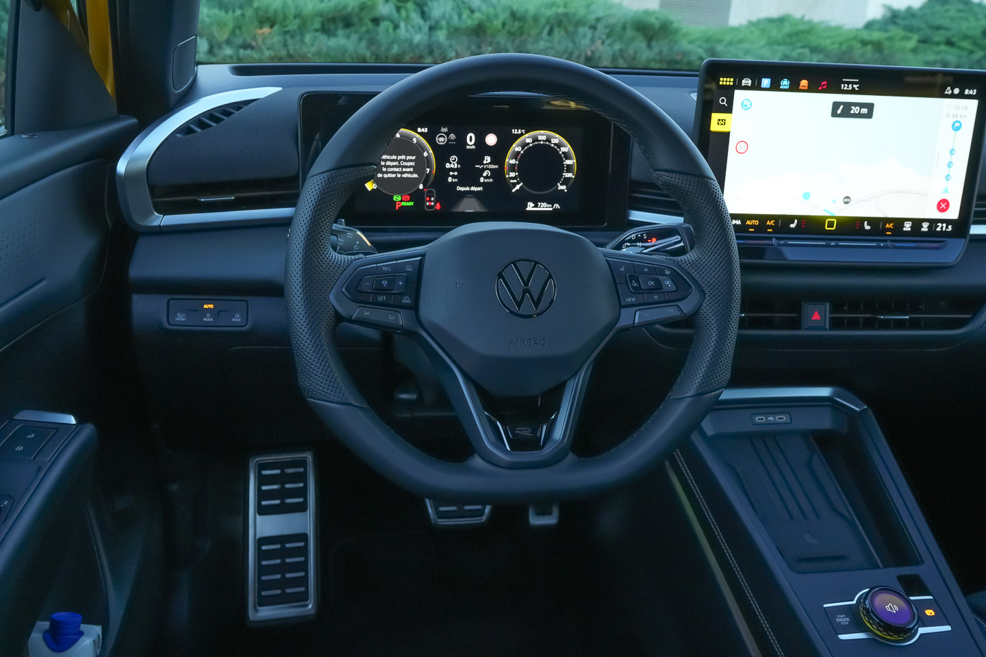 C’est ici que le bond en avant est le plus spectaculaire. Fini les critiques sur les plastiques durs omniprésents : la planche de bord mélange désormais soft-touch sur la partie supérieure, inserts aluminium brossé ou noir piano soignés, le tout avec des assemblages précis. L’écran central tactile passe à 12,9 pouces de série (jusqu’à 15 pouces en option), le Digital Cockpit Pro (10,25 ou 12,3 pouces) est inclus sur toutes les versions. Volkswagen a corrigé le tir après les boutons haptiques, retour à des molettes et boutons physiques.