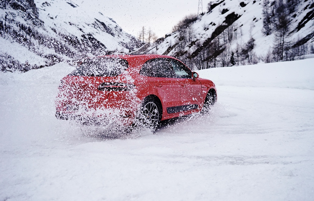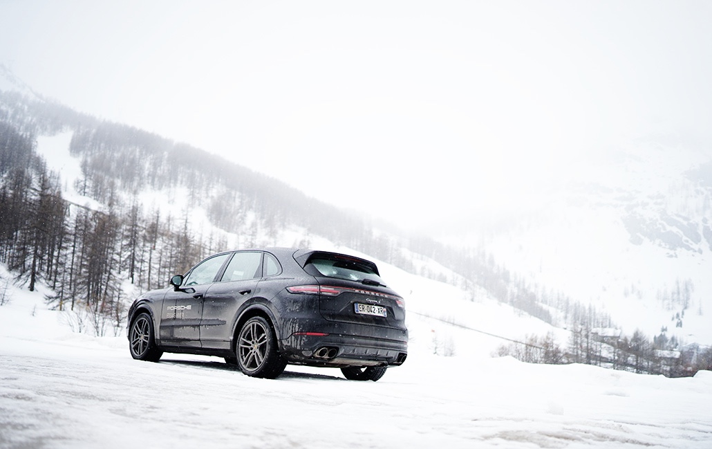 Arrivés à Val d’Isère, on découvre le superbe hôtel « le Yule », situé au bas des pistes, qui sera notre « camp de base » pour ces essais ! Direction la piste sur glace de Val d’Isère pour un peu « tâter la glisse ». Une grande aire d’évolution permet de tester les différents modes d’assistance en toute sécurité. Pas si évident de faire une belle glisse, fluide et régulière mais après quelques tentatives ça commence à rentrer. Le Macan est facile à maitriser, ses 4 roues motrices lui laissent un caractère survireur intuitif à contrôler et hyper fun quand on a compris le mode d’emploi. Le baptême de piste avec le pilote instructeur me permet d’apprécier le travail de transfert de masse, appel, contre-appel, superbe maîtrise de pilotage.