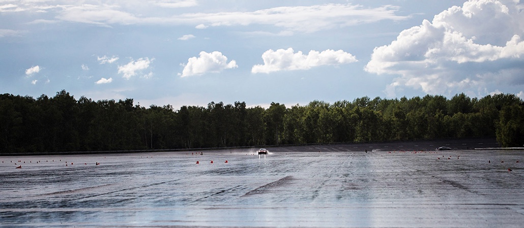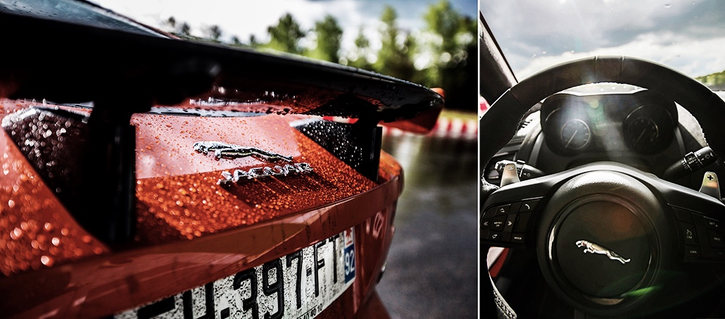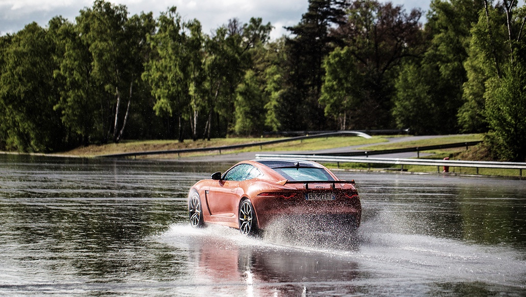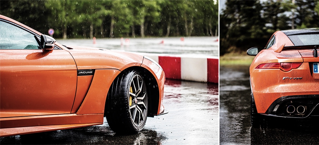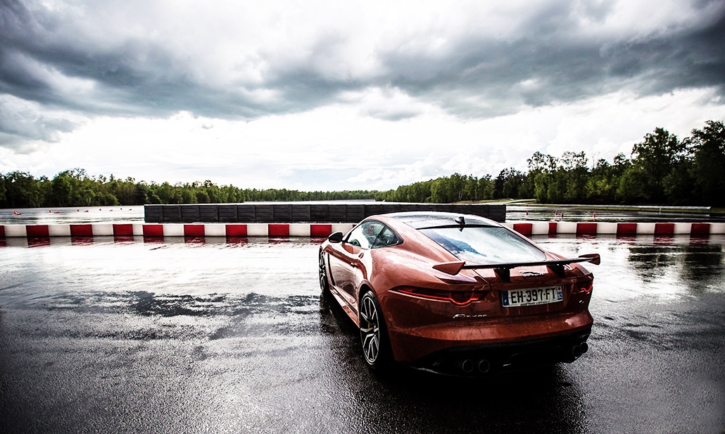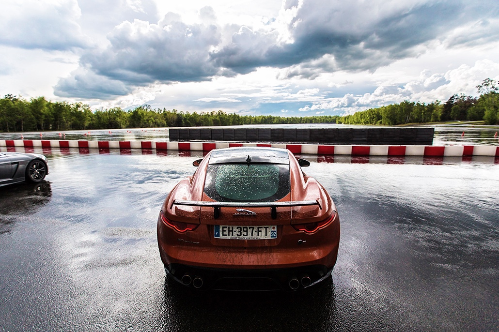 Pour commencer à se familiariser, on fait le tour d’une « simple » F-Type S. Je prends le volant, et commence à rouler sur l’aire plane… bien entendu, écrit comme ça, ça ne fait pas rêver. Néanmoins, sur une piste totalement détrempée, faire des tours d’un « circuit imaginaire » délimité par des cônes sur l’aire plane permet de se lâcher sans prendre trop de risques. J‘ai ainsi pu me permettre des accélérations et des freinages que je n’aurais jamais osé faire sur un vrai circuit avec de telles conditions météo.
